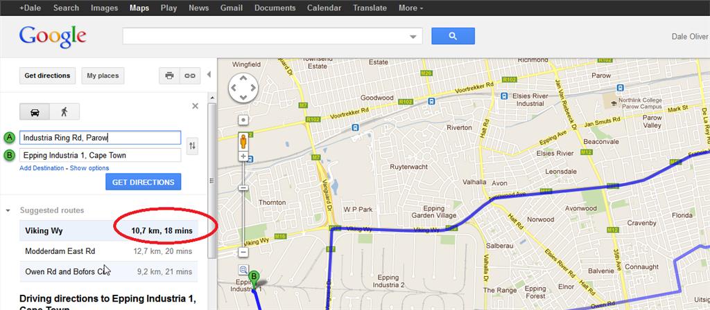 | Dale Oliver 4/25/2012 9:04:25 AM Hi Nathan, Thanks a million for your help/interest in this idea! It does not seem to work as well as Google Maps. I am battling to get a route/distance between a suburb in Johannesburg and Cape Town, South Africa using MapQuest. Let me browse around, perhaps there are other sites with driving distances.